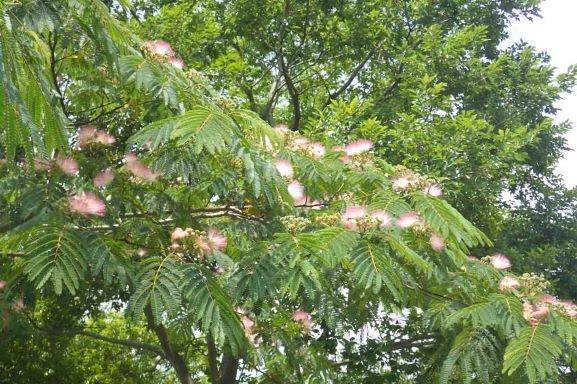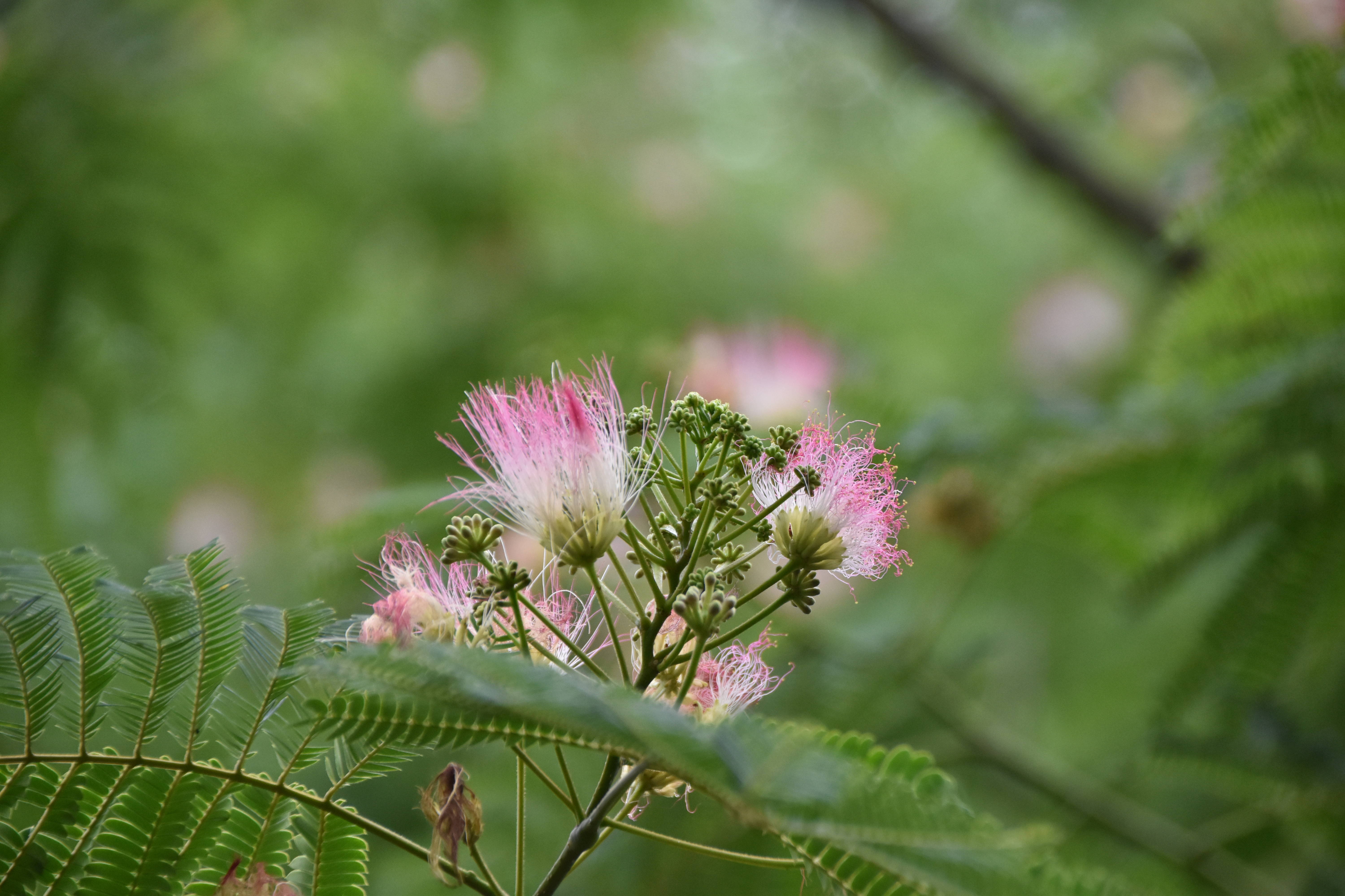 淡いピンクの刷毛のような花を咲かせます。夜になると葉を閉じて眠ったように見えるので、ネムノキの名前があります。