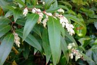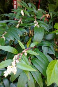 北アメリカ原産のツツジ科イワナンテン属の常緑低木です。地際からたくさんの枝を出して茂ります。枝はゆるい曲線を描いて弓状にしなります。葉は先端のとがった長楕円形で長さはおよそ15cm、厚みがあり表面には光沢があります。春に白い壷型の小花を房状に咲かせます。茎は赤茶色をしており、葉の色は緑に黄や赤い斑が入ることもあります。別名、セイヨウイワナンテン(西洋岩南天)とも呼ばれます。