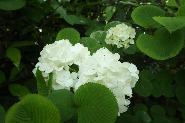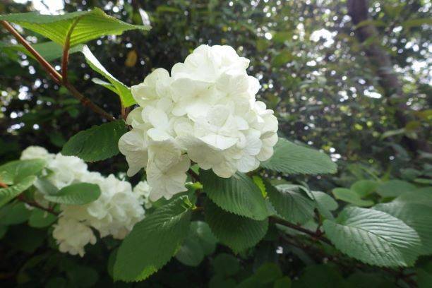 レンプクソウ科ガマズミ属の落葉低木です。枝の先端に、直径7~10cmの鞠状に密集した白い装飾花を咲かせます。装飾花とは、雄しべ・雌しべが退化し、花弁や萼(がく)が発達した花のことです。果実は結実しません。秋になると、葉が黄色や赤に変化して美しい姿を見せます。