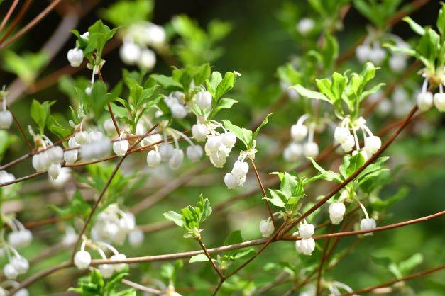 ツツジ科ドウダンツツジ属の植物です。低木の落葉広葉樹で、春に白い釣り鐘のような可愛らしい花を咲かせます。「ドウダン」は、花の作りや枝分かれの様子が、昔、夜間の明かりに用いた「結び灯台」という燭台の脚部と似通っており、その「トウダイ」から転じたものと言われています。