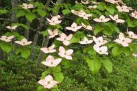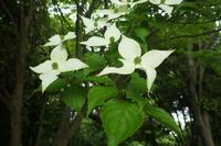 開花時期は葉が展開し終えた5~7月頃で、ハナミズキよりも遅いです。白色や薄紅色の4枚の花弁に見えるものは総苞片(そうほうへん)と呼ばれるもので、その中心に淡黄緑色で小さい花が球状に密集しています。