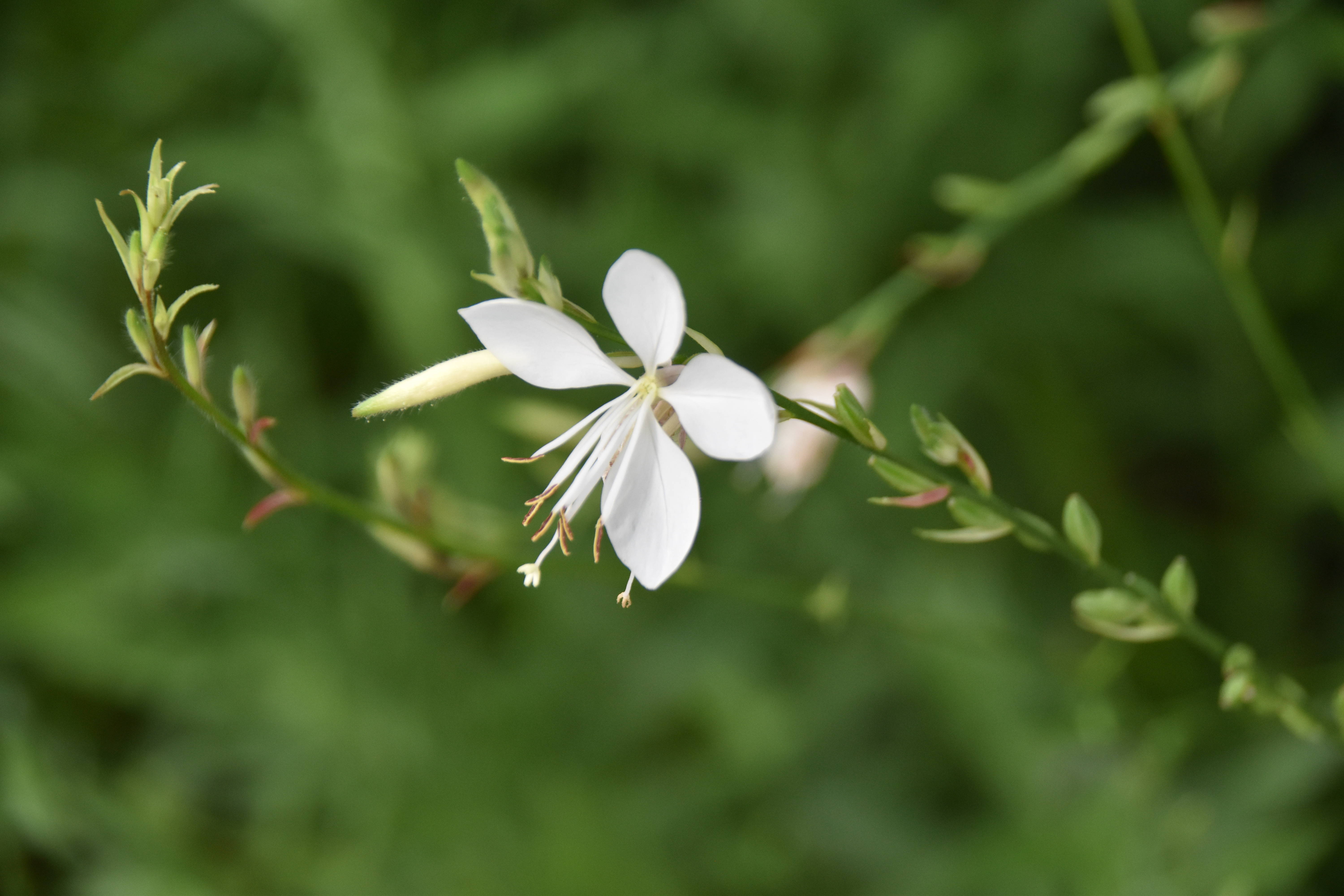 ハクチョウソウ(白蝶草)とも呼ばれます。細い茎の先に5弁の白い花をつける様はゆらゆらと蝶が飛んでいるように見えます。華奢な印象の草姿ですが、性質は強健で暑さに強く次々と花を咲かせます。