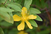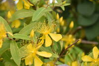 キンシバイとよく似た花を6月ごろに咲かせます。ビヨウヤナギは羽毛のような黄色いオシベを上向きにつけるので違いはわかります。落葉低木で秋になると葉は赤く紅葉します。