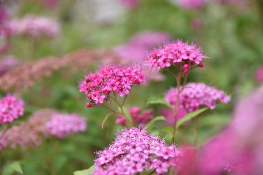 梅雨の時期に明るいピンク色の小さな花をたくさんつける植物です。コデマリやユキヤナギの仲間なので花のつくりがよく似ています。