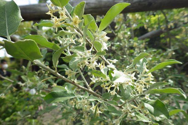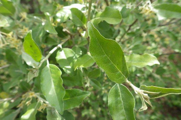 葉は枝から互い違いに生じ、長さは5~8㎝程度、表面に銀色の鱗状毛があるのが特徴です。