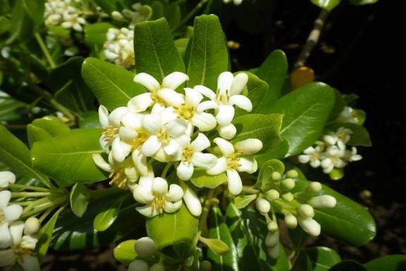 トベラ科トベラ属の常緑低木です。枝や葉、根には臭気があり、魔除けとして節分に戸口にさしたことから、トビラがなまってトベラという名がつきました。4~6月、芳香がある白い花を上向きに多数開きます。花はのちに黄色に変化します。