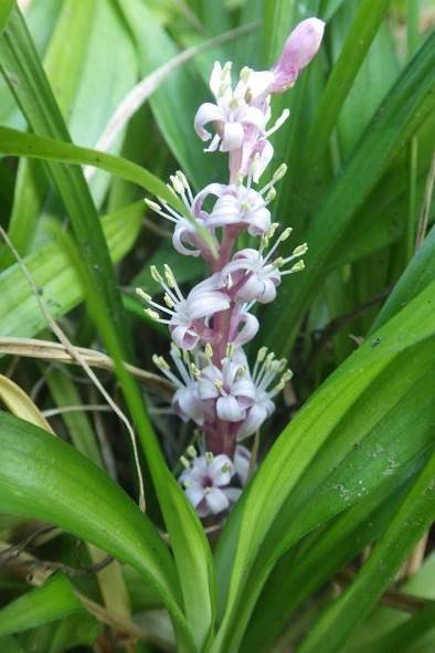 山地のやや湿り気がある日陰に群生し、葉は根元から束になって出ます。晩秋に葉の間から8~13㎝ほどの短い花茎を出し、淡紅色の花を穂状につけます。